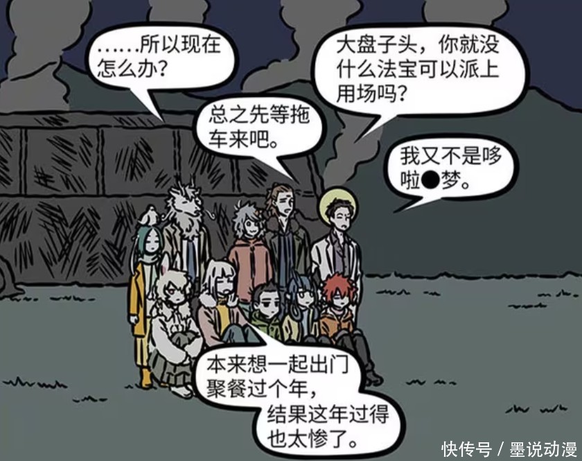 《非东说念主哉》漫画中,九月、敖烈、不雅音、小玉、哮天、杨戬等东说念主准备聚餐,这一次选择农家乐。小玉充任司机,开了五个小时车。仅仅没念念到,哮天带了瓦斯炉,还将车引爆。世东说念主倒是没奈何受伤,不外方针地是去不了,也没办法聚餐。哮天准备了饼干,但凄婉外岭的亦然什么东西都莫得。不外这一次聚餐天然糟糕,但还好隔壁有炊火晚会,也算是有所成绩。