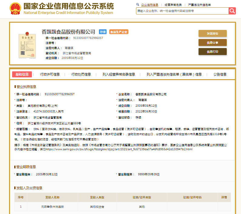 国度企业信用信息公示系统清晰,香飘飘食物股份有限公司成立于2005年,注册本钱41074.58万元东说念主民币,法定代表东说念主蒋建琪。2017年,香飘飘登陆上交所,成为“中国奶茶第一股”。