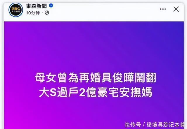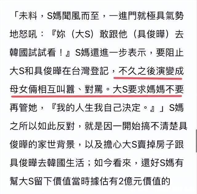 固然黄春梅莫得直呼其名,但是她在说谁大众皆冷暖自知,可见S妈对大S的这段面孔是有多落寞奋。 但是大S但是一个坐言起行的女东说念主,就连她第一段和汪小菲的面孔,皆是一见属意之后的闪婚,戋戋姆妈的反对怎么能各别得了她。 为了安抚姆妈,她将我方在台北的一套价值两个亿的豪宅过户到了姆妈的名下,给她的姆妈吃下了一颗释怀丸。