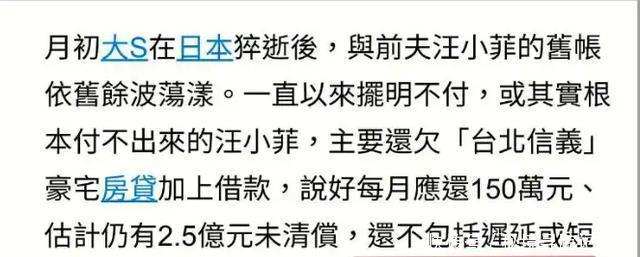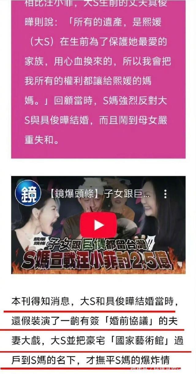 当今,大S留住无数遗产皆留给了S妈和两个孩子,但是因为两个孩子皆还莫得成年,因此S妈的作风就显得尤为重要。 2月20日,有媒体曝料,大S的前夫汪小菲也决定加入这场遗产争夺战,况且将会在最近到达台湾,和S家伸开正面交锋。 S家和汪小菲运转争产,具俊晔行止成谜 字据台媒报说念,汪小菲在台湾还有2.5个亿的债务莫得偿还,前次他回到台湾也莫得如数反璧,反而是演了一场戏之后就回到了北京。