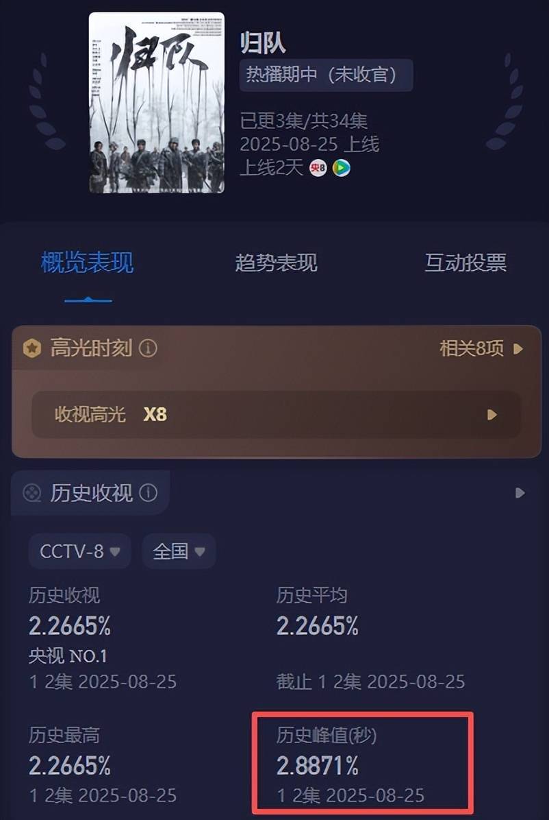 《归队》上星央视八套,仅播1晚收视率峰值松开破2.8,拿下宇宙收视第一的好获利,看来国产抗战外传剧也迎来新的天花板了。