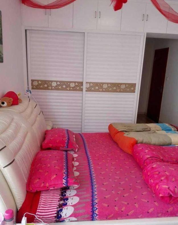 卧室进门就看到了这个衣柜,上头还作念了好多吊柜,百叶窗式的柜门,看起来前卫漂亮,内部空间也很大,推拉门式的谈论打算也很粗浅!