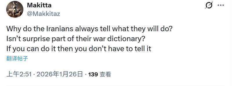 在社交媒体平台“X”上,不少网友对这条新闻发表驳斥,争论好意思国会不会对伊朗动武。有东说念主说:“海报不是导弹,而是信息传递器具。真实的干戈不会画在墙上,德黑兰昭着这少量。”有东说念主质疑:“为什么伊朗东说念主总要提前预报他们的计较?‘出其不料’难说念不在他们的‘干戈辞书’里?”也有东说念主用戏谑的口吻警告称,从朝鲜、越南到伊拉克,好意思国耐久不会吸取训戒,“如今在好意思国国内,咱们尽然在抨击我方东说念主,险些让东说念主惊呆了”。